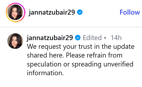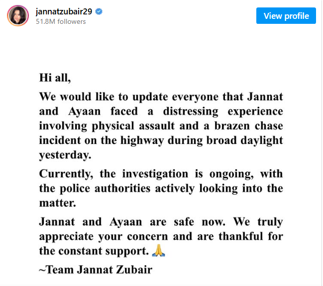 The statement said, we want to update everyone that Jannat and Ayaan were assaulted and chased in broad daylight on the highway yesterday. Currently, police authorities are actively looking into the matter and the investigation is ongoing.