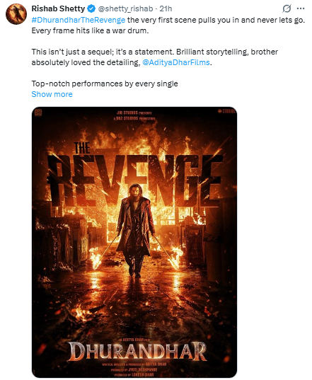 Rishabh Shetty wrote on his Praising Aditya Dhar, he said, “Every frame of the film beats like a war drum. It’s not just a sequel, but a statement. It’s a pleasure to see the brilliant story and detailing.” Rishabh also praised the editing and background music of the film.