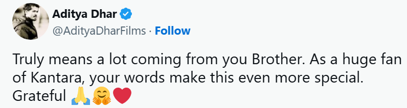 To this, Aditya Dhar replied, “It means a lot to receive praise from your mouth. I myself am a big fan of ‘Kantara’, so your words are very special for me.”